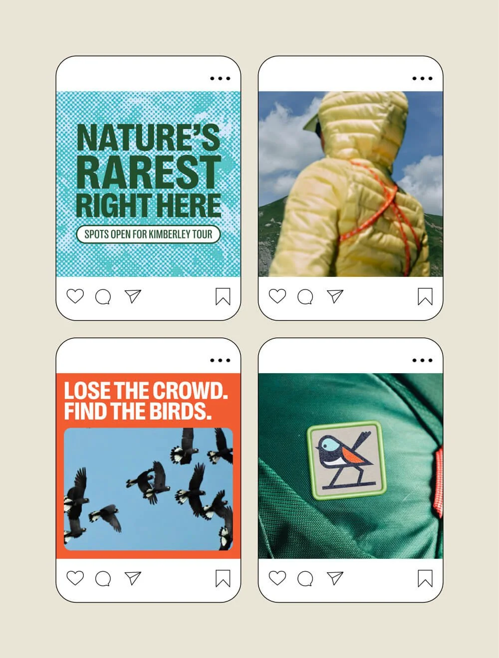 Inspired by traditional field guides and trail markers, the visual identity blends natural detail with confident, functional design. I developed custom icons and image treatments that celebrate birdlife as a window into the landscape, while the use of bold typography and strong composition adds energy and direction. The brand is designed to spark curiosity and mirror the spirit of the tours. It feels immersive, awe-inspiring and grounded in a deep respect for nature.
