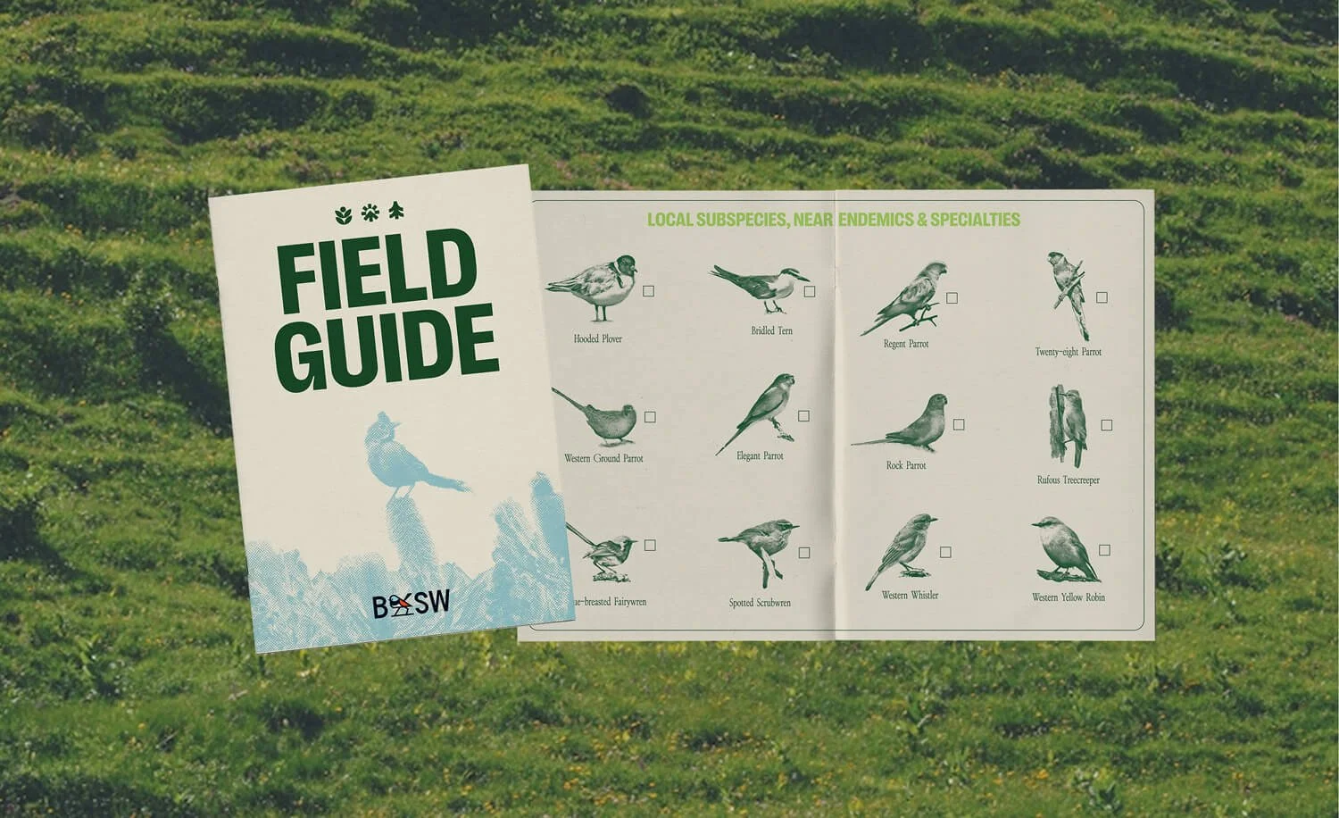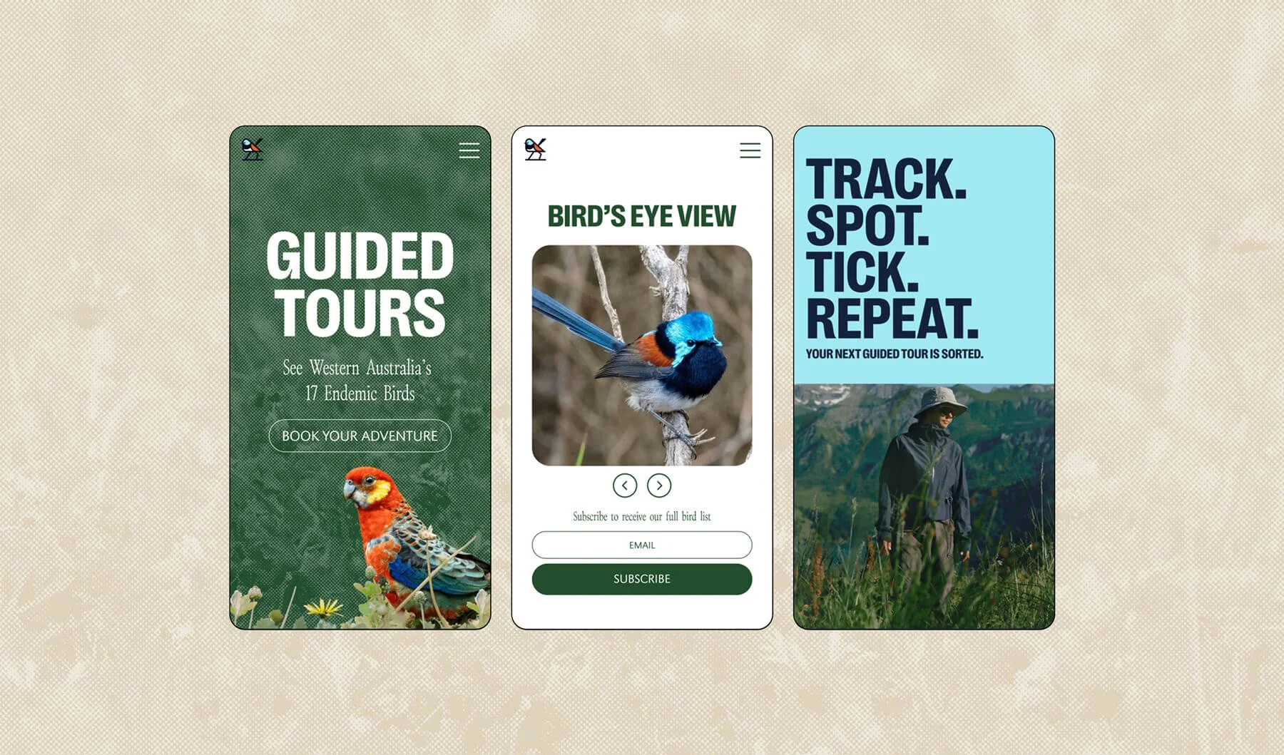 the biodiverse and striking landscapes of Western Australia’s Southwest, a region known for its rare species and ecological richness. These tours are crafted for birdwatchers, photographers and nature seekers who want to experience wildlife in its natural habitat. As the designer, I set out to create a brand that reflects the quiet wonder of birdwatching while also capturing the bold sense of exploration that comes with venturing into these remote and beautiful places.